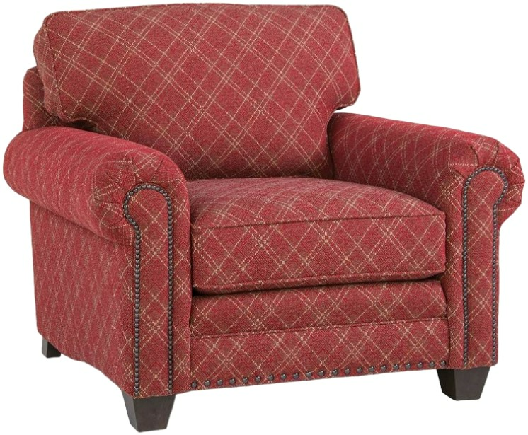 This chair features a semi-attached back and nailhead trim accent, roll arm, and box seat cushion backrest. Beautifully complemented by exposed wood legs. Available in a variety of wood finish options and American-made custom upholstery.Read More