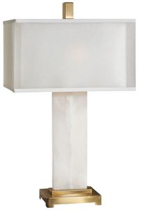 White alabaster base accented with plated coffee bronze details. The double shade is a sheer outer hardback with a white linen inner hardback.Read More
