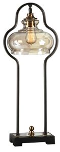 Curvaceous forged iron finished in an aged black, following the contour of the light amber glass shade, accented with brushed, antiqued brass plated details. 60 watt, BT-58 antique style bulb included.Read More
