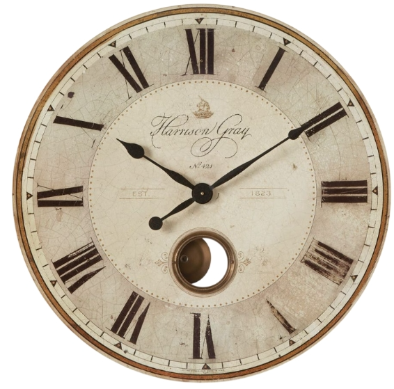 Weathered, laminated clock face with brass center components and internal pendulum