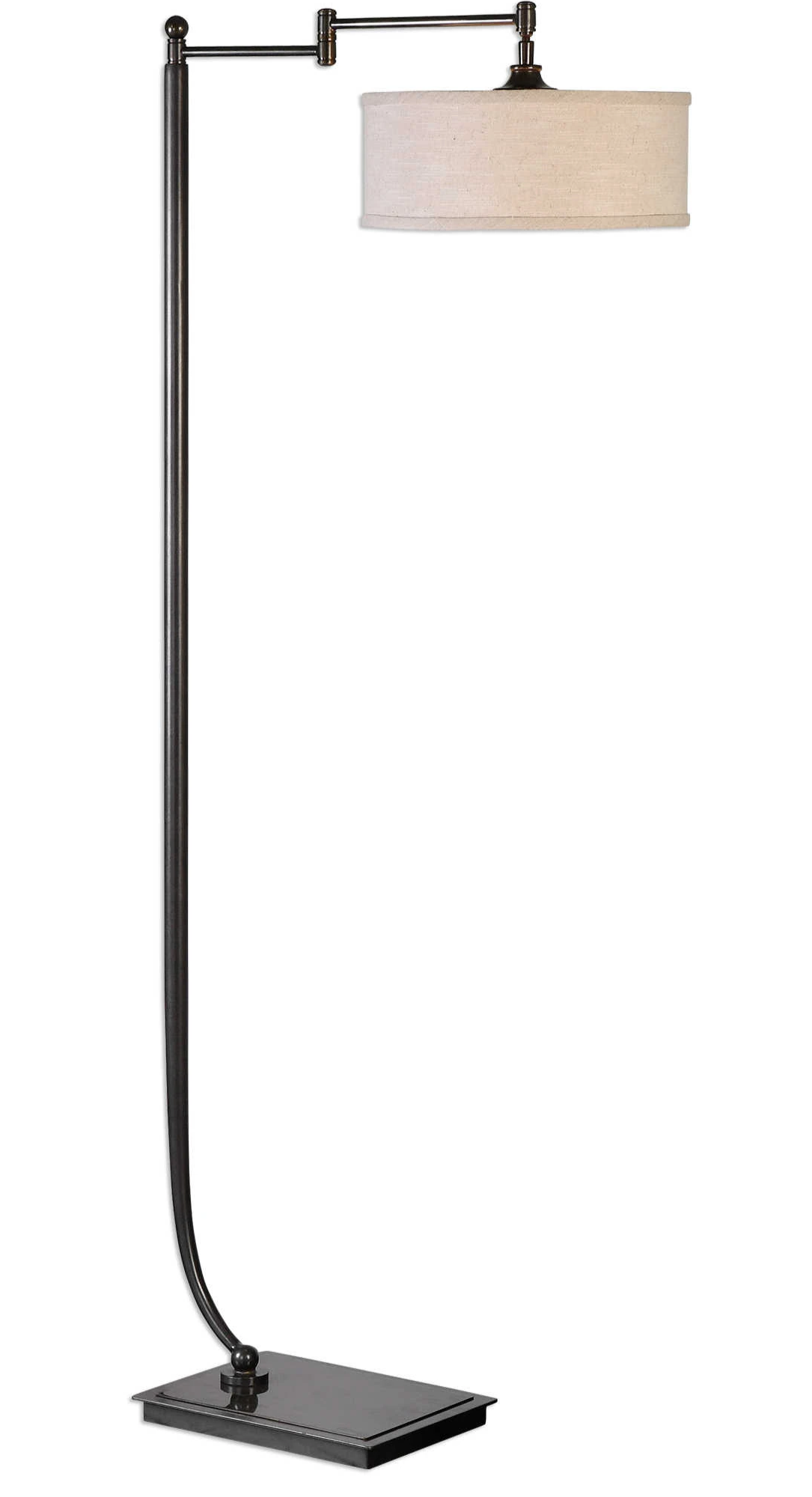 Tapered metal base finished in a plated dark bronze accented with an oxidized bronze foot plate featuring a pivoting shade arm. The suspended round drum shade is a beige linen fabric with natural slubbing.Read More
