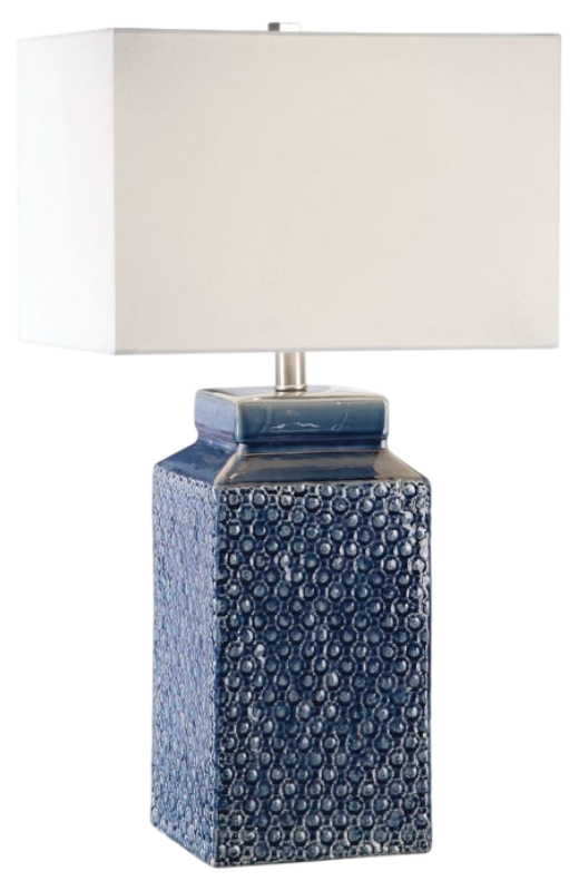 The Vardenis table lamp is textured ceramic finished in a fired Sapphire blue glaze accented with brushed nickel plated details and a square crystal finial. The rectangle hardback shade is a white linen fabric.Read More