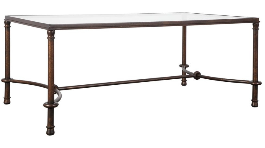 Inspired by ancient horse bridles, this forged iron coffee table is a blending of rings and curves finished in rustic bronze patina. The top is made of clear, tempered glass.Read More